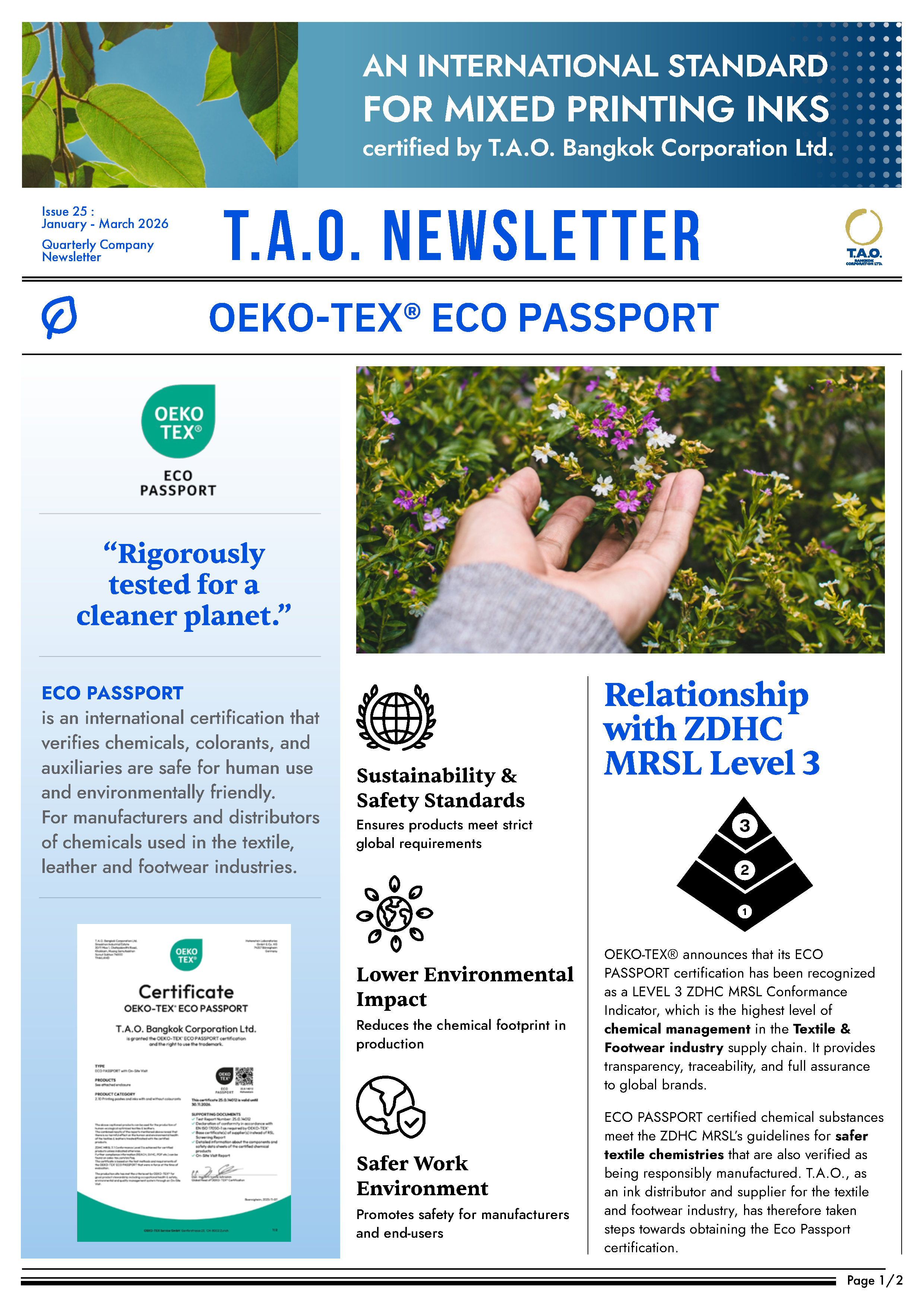 For this edition, the 25th issue, we are pleased to introduce OEKO-TEX® ECO PASSPORT, an international standard for mixed printing ink certified by T.A.O. In the next feature, Unlocking innovation with special pigment, which highlights thermochromic pigment, glow-in-the-dark pigments, and antimicrobial inks. And in our final story, T.A.O.'s 31st anniversary, “Years of Growth and Success.”
